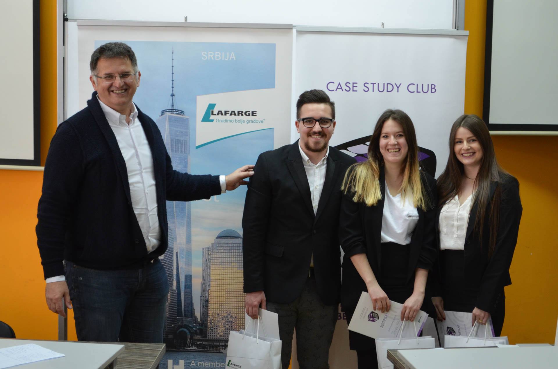 Želimo da se zahvalimo generalnom direktoru kompanije Lafarge, gospodinu Dimitriju Knjeginjiću, Radetu Bučevcu, direktoru za marketing i strategiju kompanije Lafarge, prof. dr Vesna Damnjanovic koja je još jednom stvorila mogućnost studentima Case Study Club-a FON-a da stiču nova znanja i iskustva, Emi Nešković i Nataša Vladisavljević na izvanrednoj organizaciji. Pored toga zahvaljujemo se ostalim članovima upravnog odbora kompanije Lafarge, koji su podelili svoje znanje i time pomogli takmičarima da se što bolje pripreme za rešavanje poslovne studije slučaja. Zahvaljujemo se i sponzoru ovogodišnjeg lokalnog takmičenja, kompaniji Vino Župa na obezbeđenom osveženju.