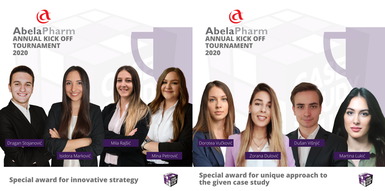 AbelaPharm, domaći lider za razvoj i proizvodnju farmaceutskih proizvoda, u nameri da bolje razume stavove mladih generacija o farmaceutskom tržištu, navikama kupovine, kao i novim digitalnim mogućnostima komunikacije ka stručnoj i široj javnosti, angažovala je članove Case Study Club-a, koji su podeljeni u 6 takmičarskih ekipa, imali priliku da reše izazovnu poslovnu studiju slučaja koja je zahtevala detaljnu analizu različitih brendova koji se nalaze u okviru diverzifikovanog porftolija ove kompanije. Tim koji su činili Stefan Nenadić, Milena Gatić, Lazar Sević i Jovan Kovačec osvojio je nagradu za najbolji strateški pristup, kao i nagradu za najbolje marketing istraživanje. Nagradu za inovativnu strategiju osovijio je tim koji su činili Dragan Stojanović, Mina Petrović, Mila Rajšić i Isidora Marković, dok je tim koji su činili Dorotea Vučković, Dušan Višnjić, Zorana Dulović i Martina Lukić osvojio specijalnu nagradu za jedinstven pristup studiji slučaja. Naša članica, Milena Gatić, osvojila je specijalnu nagradu za najboljeg prezentera na ovogodišnjem turniru.