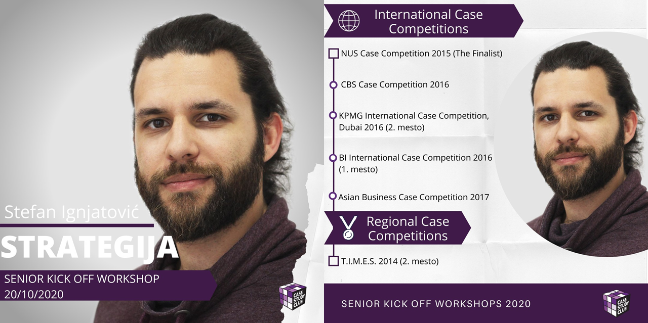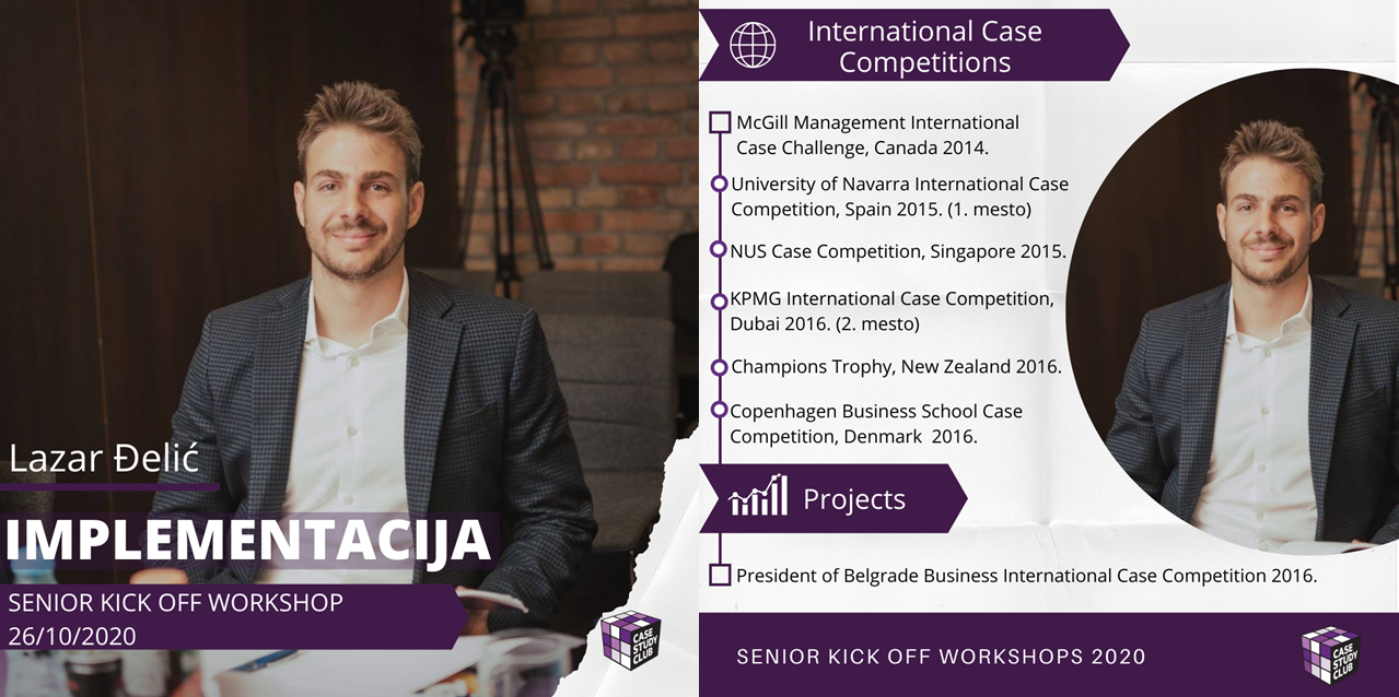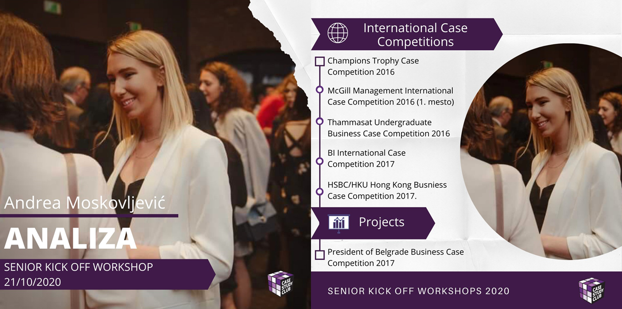 Prva radionica održana je 20.10.2020. na temu Ananliza i predavač je bila Andrea Moskovljević. Andrea trenutno živi u Parizu gde završava master studije iz oblasti Data Science and Digital Marketing i paralelno radi za Spendesk, jedan od najbrže rastućih evropskih fin-tech startup-a, kao Customer Intelligence Analyst. Ona je diplomirala na Fakultetu organizacionih nauka 2018. godine, a tokom studija bila je član Case Study Club-a i predstavnik Univerziteta u Beogradu na pet svetskih takmičenja u rešavanju poslovne studije slučaja. Narednu radionicu održao je Stefan Ignjatović 21.10.2020. na temu Strategija. Stefan danas radi kao Account Manager u kompaniji Four Dots Digital Marketing Agency. Tokom studija je bio potpredsednik za mentorstvo i alumni, a danas je i sam jedan od najistaknutijih alumni članova Case Study Club-a, koji je učestvovao na brojnim regionalnim i svetskim takmičenjima. Nakon toga, 26.10.2020. održana je treća radionica na temu Impementacija koju je održao Lazar Đelić. Lazar danas živi u Pragu, gde je zaposlen kao Key Account Manager za Home Care u jednoj od najvećih svetskih korporacija - Unilever. On je 2016. godine bio predsednik Belgrade Business International Case Competition-a, čemu su prethodila mnogobrojna takmičenja na kojima je uspešno predstavljao naš klub, kao i Fakultet organizacionih nauka. I završna, četvrta radionica, održana je 28.10.2020. od strane Anđelije Đorđević na temu Efekti, čime smo uspešno zaokružili priču o rešavanju poslovne studije slučaja. Anđelija trenutno radi na Fakultetu organizacionih nauka u Beogradu kao saradnik u nastavi na predmetima Menadžment i Strateški menadžment. Ona je u toku svojih studija uspela da postigne neverovatne akademske rezultate, a u isto vreme predstavljala je klub na velikom broju takmičenja i bila je deo Izvršnog odbora 2018/19. kao potrpedsednica za mentorstvo i alumni.